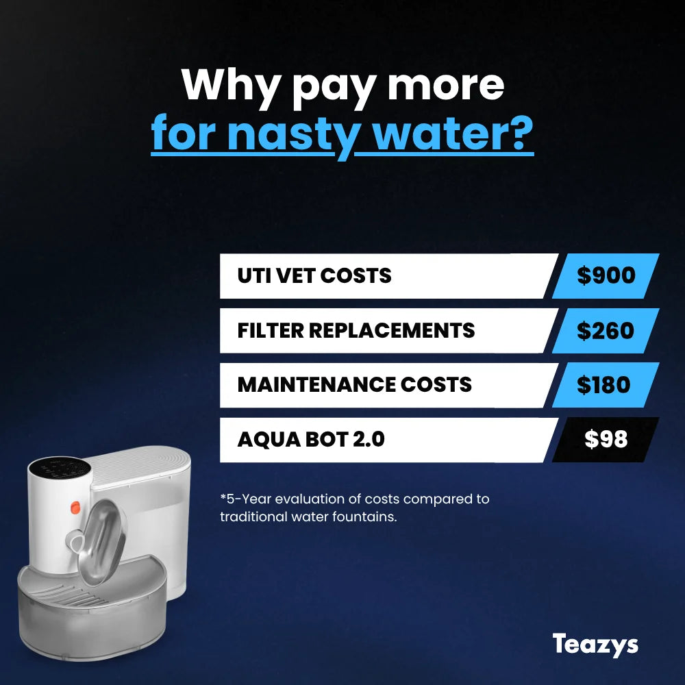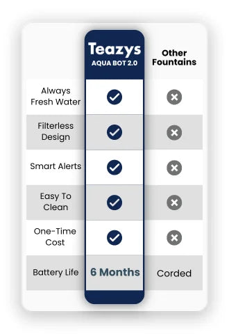 Most water fountains are noisy, require constant filter changes, and only recycle the same water. The Aqua Bot is different—it delivers fresh water every time, is low maintenance, and will save you money in the long run.